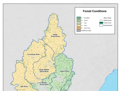 - Overall grades ranged from fair (C) to poor (D). Some areas scored higher for specific components. For example, the Speed River and McKenzie Creek basins scored higher for forest cover and riparian forest cover.